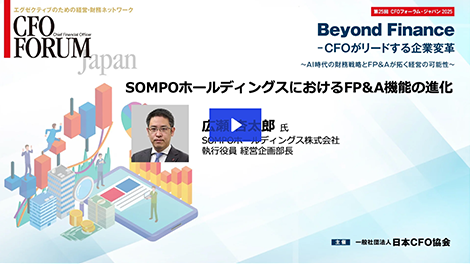 SOMPOホールディングスにおけるFP&A機能の進化 市場ボラティリティの高まり、事業の多角化、IFRS対応などに起因し、「過去の予実」から「将来のシミュレーション」へ。変化のスピードが増すなか、将来を見据えた分析とシミュレーションに基づく意思決定=FP&Aの重要性が高まっている。大手損害保険グループにおけるFP&A機能の進化について、取組みの背景、組織設計・人材育成、進化のプロセス、直面したチャレンジとその対処方法などを、実例を交えて紹介する。
