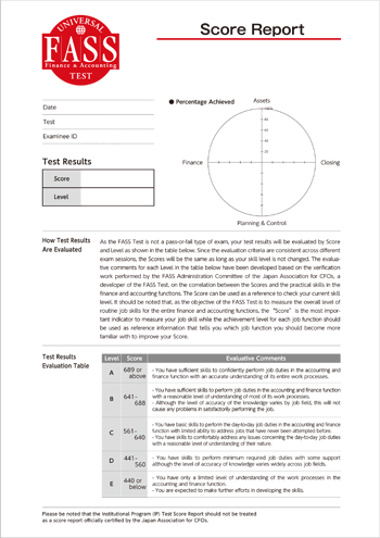 試験結果(スコア・レベル・分野別達成度合)は試験終了後に各受験者のパソコン画面に表示されます。また、試験結果をスコアレポート(英文)として保存・印刷することができます。